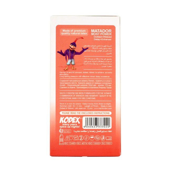 خرید کاندوم کدکس خاردار و حلقوی ماتادور، کاندوم خاردار حلقوی ماتادور علاوه بر برجستگی های خاردار، حلقه هایی بر روی سطح خود دارد که باعث تحریک بیشتر می شوند. همچنین این کاندوم حاوی ماده موثر تاخیری بوده و انزال آقایان را به تاخیر می اندازد، که این خاصیت نیز رابطه را طولانی تر و گرم تر خواهد نمود. کاندوم Matador از نوع کاندوم رنگی بوده و نوک ذخیره این کاندوم به امنیت بیشتر در رابطه کمک می کند.