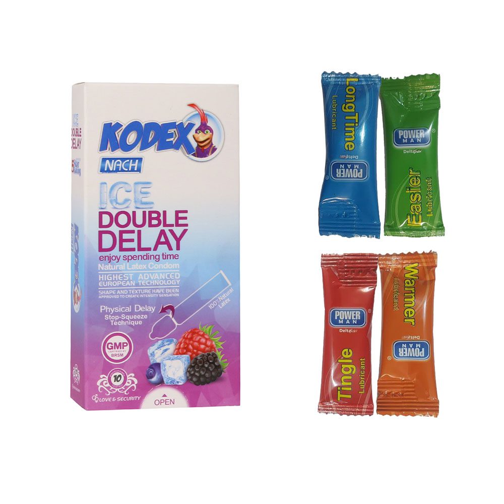خرید کاندوم کدکس تاخیری دوبل یخی با پک ژل مخصوص، این محصول که به همراه 4 بسته ژل روان کننده، تاخیری، تحریک کننده و تنگ کننده واژن ارائه شده حس متفاوتی را در روابط عاشقانه شما ایجاد می کند. با توجه به تنوع ژل ها با سلیقه افراد به طوری که یک حس جدیدی را بخواهند تجربه کنند می تواند مفید باشد. اگر به دنبال یک کاندوم با کیفیت به همراه ژل مخصوص هستید می توانید این محصول کاربردی و پرفروش را تهیه کنید.